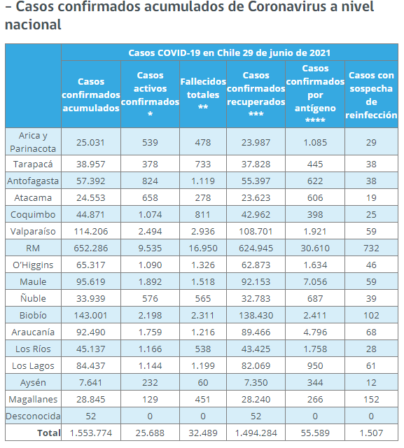 La cifra total de personas que han sido diagnosticadas con COVID-19 en el país alcanza a las 1.553.774. De ese total, 25.688 pacientes se encuentran en etapa activa. Los casos recuperados son 1.494.284.