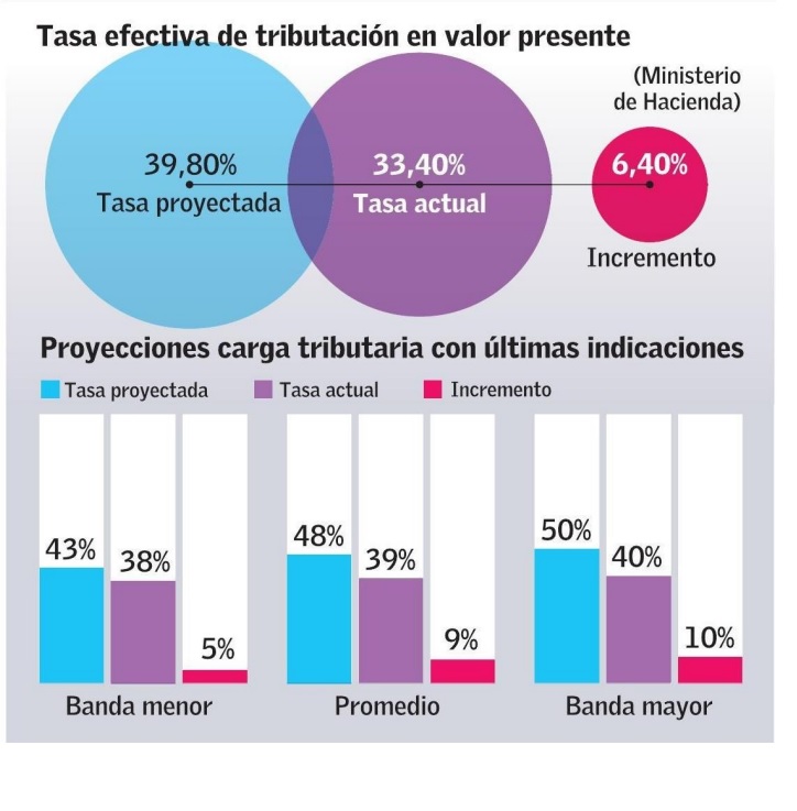 El ejecutivo calcula que los niveles actuales de tributación efectiva de las faenas locales se encuentran en torno al 33% y 35 %, por debajo de la carga observada en competidores como Perú y Australia, con cargas tributarias entre 40% y 46%, significando una brecha entre 7 11 puntos.