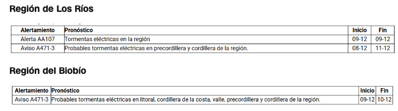 El Servicio Nacional de Prevención y Respuesta ante Desastres (Senapred) decretó este martes Alerta Temprana Preventiva Regional para Los Ríos y Biobío, luego de que la Dirección Meteorológica de Chile (DMC) emitiera alertas y avisos por tormentas eléctricas que se presentarán en ambas zonas.