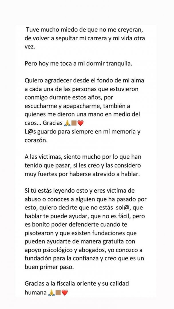 “Si tú estás leyendo esto y eres víctima de abuso o conocer a alguien que ha pasado por esto, quiero decirte que no estás sol@, que hablar te puede ayudar, que no es fácil, pero es bonito poder defenderte cuando te pisotearon y que existen fundaciones que pueden ayudarte de manera gratuita con apoyo psicológico y abogados”, finalizó escribiendo la exMasterChef.