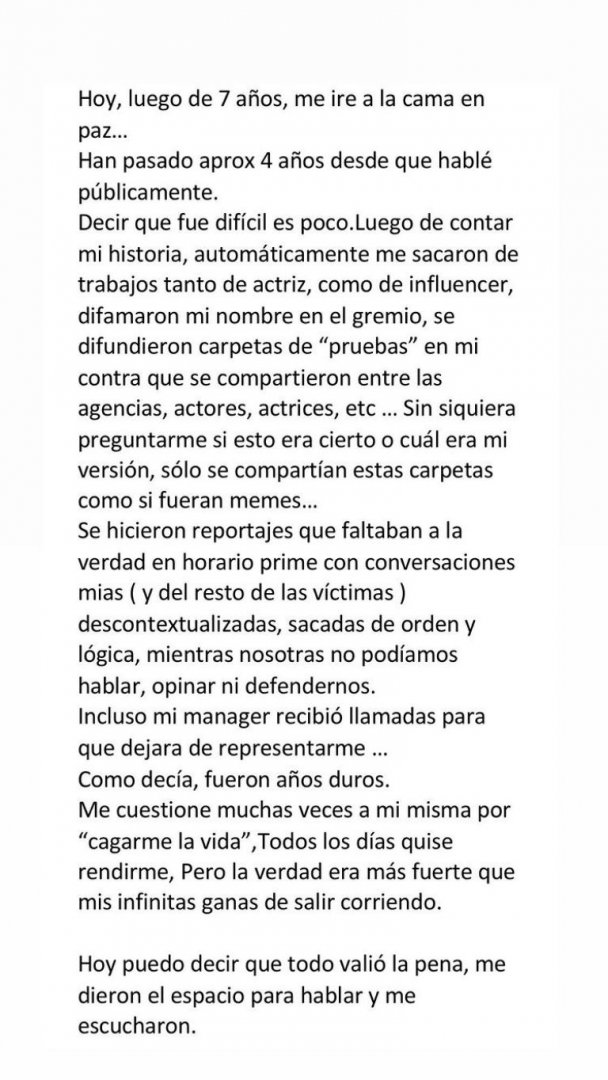 “Hoy, luego de siete años, me iré a la cama en paz... Han pasado aproximadamente 4 años desde que hablé públicamente. Decir que fue difícil es poco. Luego de contar mi historia, automáticamente me sacaron de trabajos tanto de actriz como influencer, difamaron mi nombre en el gremio, se difundieron carpetas de ‘pruebas’ en mi contra que se compartieron entre las agencias, actores, etc, sin siquiera preguntarme si era cierto o cual era mi versión, sólo se compartían estas carpetas como si fueran memes”, partió diciendo en 'Instagram'.