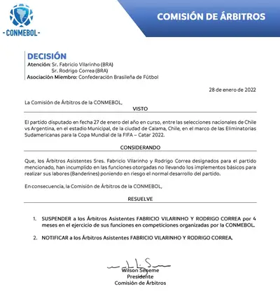 La Confederación Sudamericana de Futbol (Conmebol) suspendió a los guardalíneas que olvidaron su respectivo banderín en la derrota de la selección chilena ante su par trasandino.