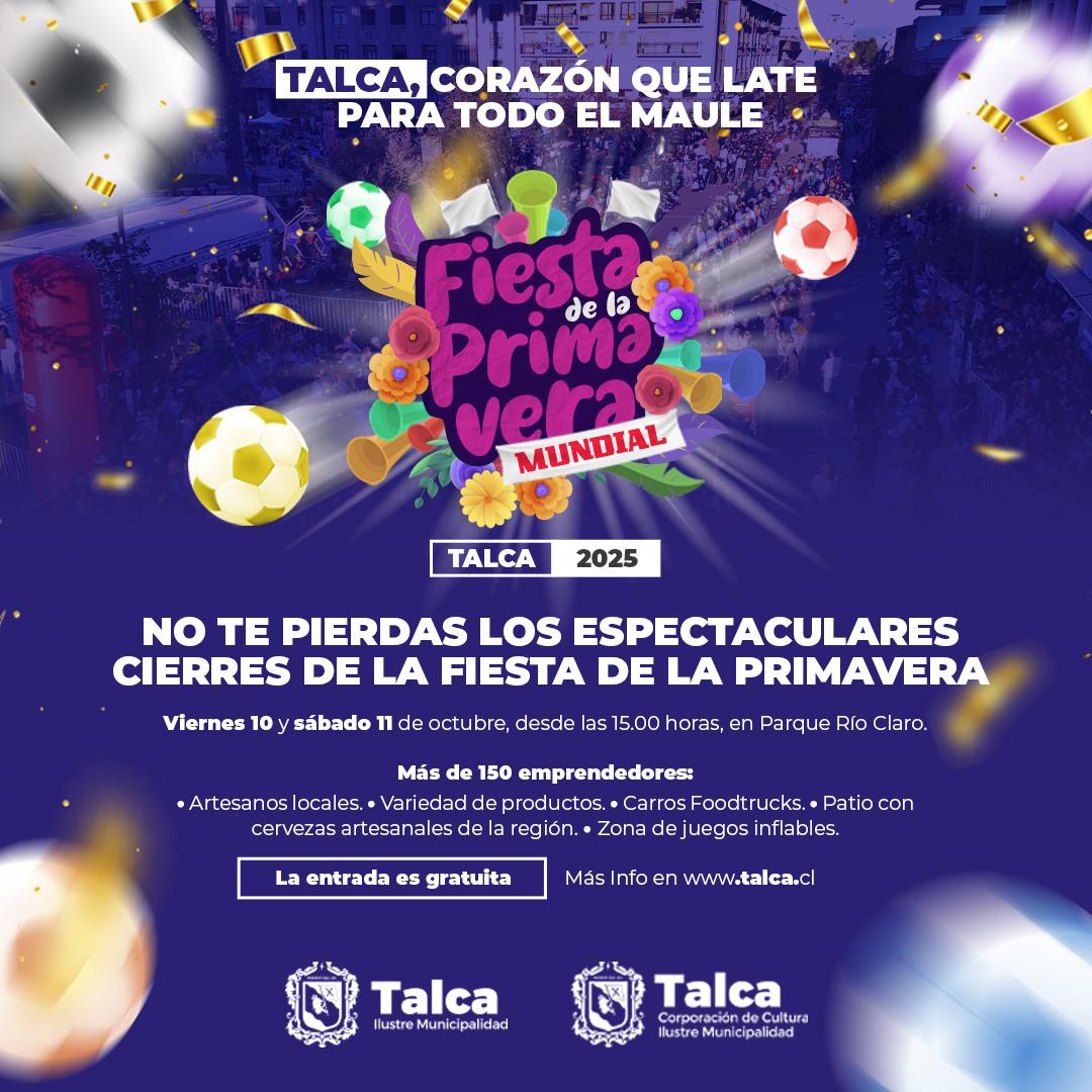 La Fiesta de la Primavera 2025, organizada por la Municipalidad de Talca, a través de su Corporación Municipal de Cultura, llega a su esperado cierre este viernes 10 y sábado 11 de octubre en el Parque Río Claro de Talca, con dos jornadas llenas de música, diversión y actividades familiares. Desde las 15:00 horas, el público podrá disfrutar de un espacio gratuito con más de 150 emprendedores locales, patio cervecero, zona de foodtrucks, artesanías, juegos infantiles y mucho más.