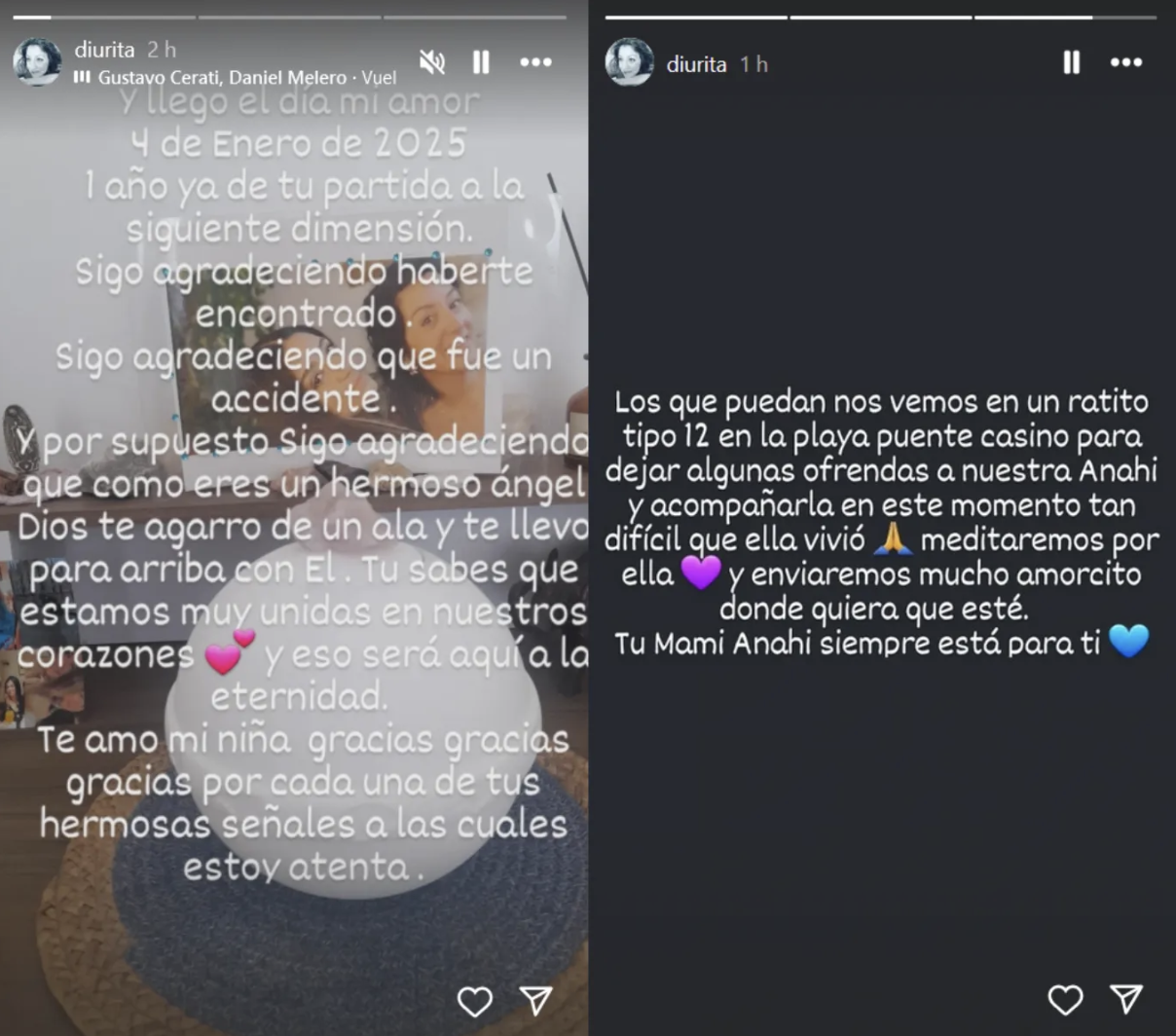 Asimismo, hizo un llamado a acompañarla a ella y a su hija en este difícil momento. "Los que puedan, nos vemos en un ratito, tipo 12, en la playa Puente Casino, para dejar algunas ofrendas a nuestra Anahí", redactó.