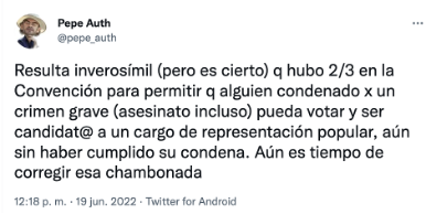 Uno de los que salió a criticar firme y sin titubeos el tema fue el ex parlamentario y analista político Pepe Auth, “Resulta inverosímil (pero es cierto) q hubo 2/3 en la Convención para permitir q alguien condenado x un crimen grave (asesinato incluso) pueda votar y ser candidat@ a un cargo de representación popular, aún sin haber cumplido su condena. Aún es tiempo de corregir esa chambonada”, dijo en su último tweet.