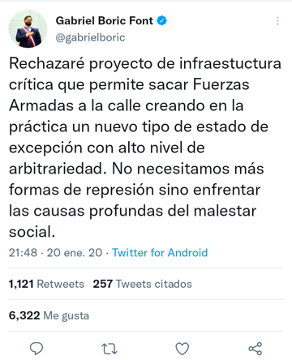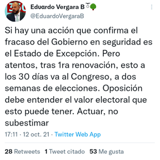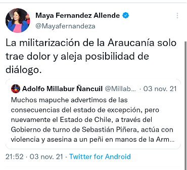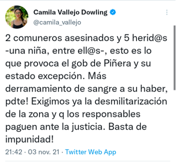 Fue también la ministra de Desarrollo Social, Jeanette Vega, conocida por sus salidas de libreto, quien antes se refirió a esto “¿El Estado de Excepción qué significa? Coartar un montón de libertades y, por otro lado, el apoyo de los militares, pero hay que estar dispuesto a que efectivamente haya muertes... y creo que no es la solución para el Wallmapu, un lugar donde ya hay una cultura de violencia y muertes”, dijo en una entrevista publicada por la Revista Ya.