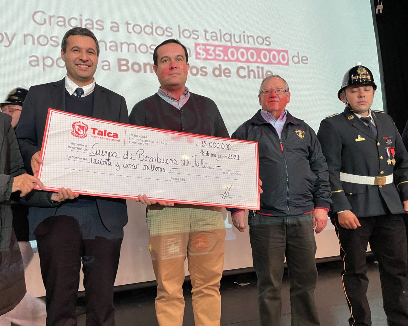Para recibir el cuantioso cheque, estuvo presente el tesorero general del Cuerpo Bomberos de Talca, Leonardo Pérez Ríos. “Primero que todo agradecemos la gestión de la municipalidad. Este monto es muy importante para nosotros, lo vamos a destinar de la mejor forma para equipos de protección personal, para el mantenimiento de nuestras máquinas y para la labor que nosotros hacemos a la comunidad”, dijo.