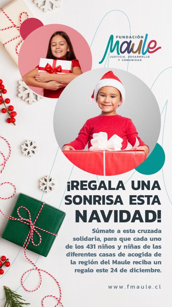 Fundación Maule está impulsando la Campaña Solidaria ¡Regala una sonrisa esta Navidad!, una iniciativa destinada a llevar alegría y esperanza a 431 niños y niñas que residen en diferentes casas de acogida de la región. La campaña busca asegurar que cada uno de estos pequeños reciba un regalo especial la noche del 24 de diciembre.