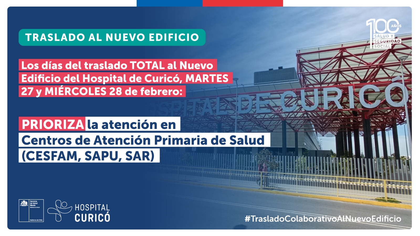 Los días martes 27 y miércoles 28 de febrero se llevará a cabo el traslado total de pacientes al nuevo edificio del Hospital de Curicó, para lo cual se hace un llamado a la colaboración y seguir algunas recomendaciones para asegurar un traslado colaborativo, exitoso y disminuyendo al mínimo algún contratiempo.