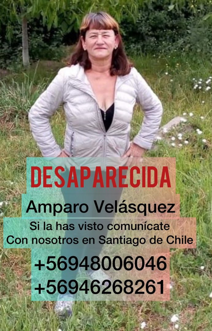Ana Karina Velásques es una ciudadana venezolana que reside en Renca, región Metropolitana, que ha denunciado la desaparición de su madre, María Amparo Velásquez de 62 años. Detalló a CHV Noticias que su madre acudió a una cita con un hombre al cual conoció por las redes sociales el 4 de septiembre, este individuo la habría pasado a buscar a la casa a eso de las 9:00 am en una camioneta blanca rumbo a San Antonio, sin embargo, asegura que no sabe cuál es el aspecto del sujeto porque ella no estaba en su domicilio.