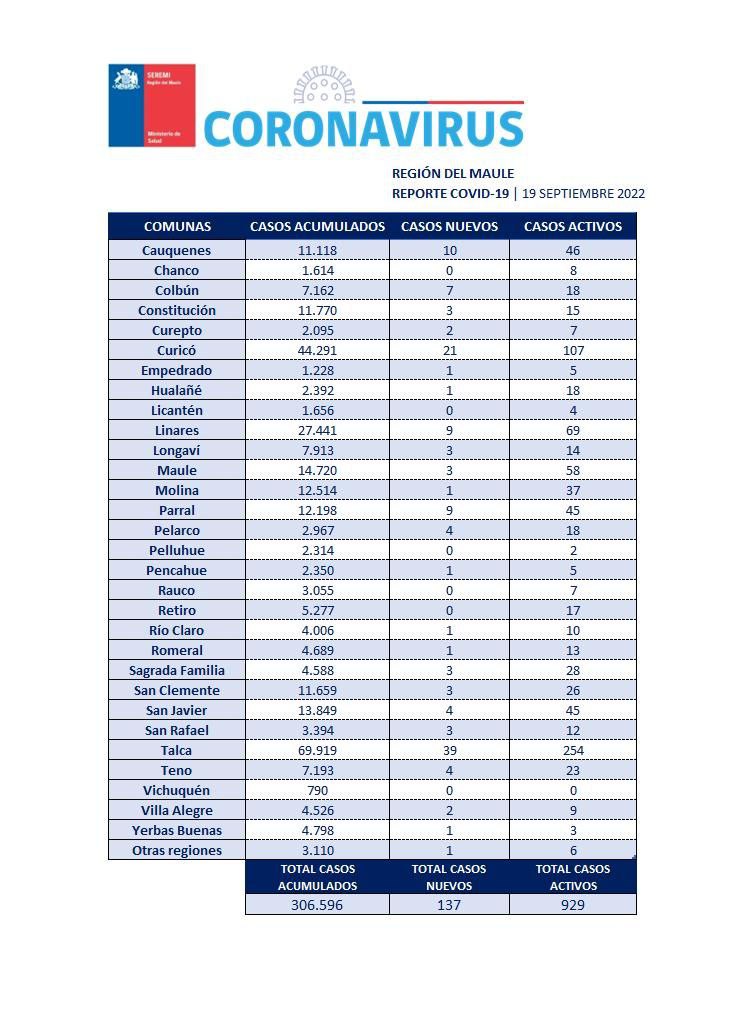 En un nuevo informe sobre la situación del Covid-19 en el Maule, desde la Seremi de Salud expusieron que en las últimas horas se registraron 137 nuevos casos, de los cuales, 114 presentaron síntomas y 16 fueron asintomáticas. Lo anterior, deja un total de 306.596 pacientes diagnosticados con la enfermedad en la región desde que comenzó la pandemia. Con respecto a los fallecidos, no se contabilizaron nuevos decesos asociados al virus en las últimas horas, por lo que la cifra total de muertos se mantiene en 3.112.