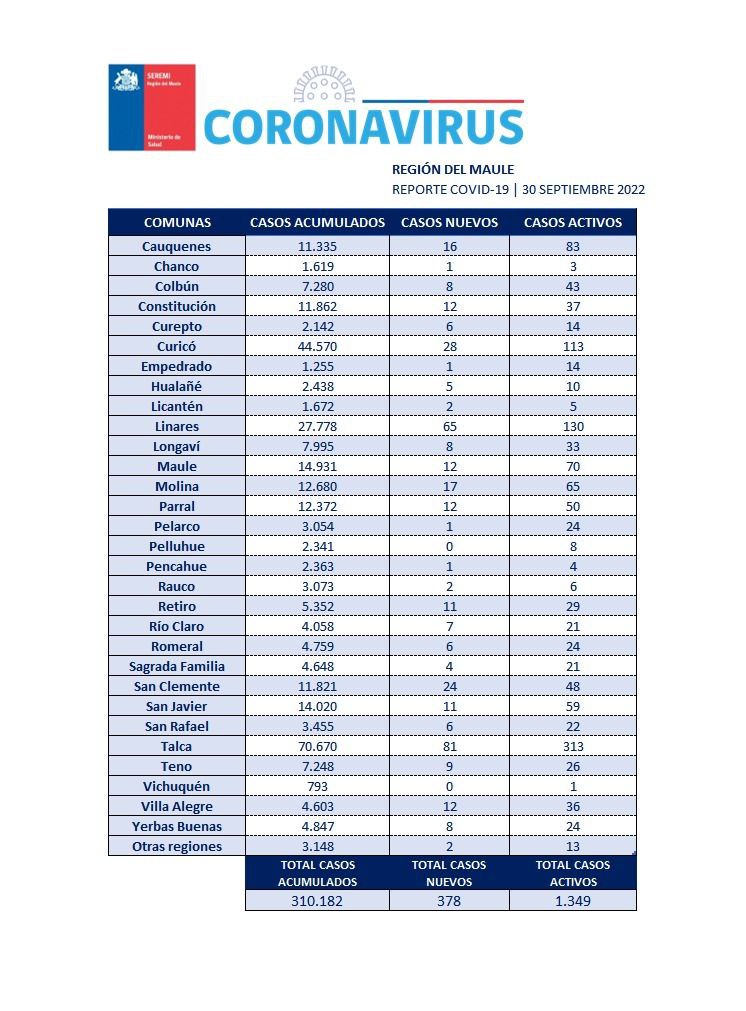 En un nuevo informe sobre la situación del Covid-19 en el Maule, desde la Seremi de Salud expusieron que en las últimas horas se registraron 378 nuevos casos, de los cuales, 285 presentaron síntomas y 36 fueron asintomáticos. Lo anterior, deja un total de 310.182 pacientes diagnosticados con la enfermedad en la región desde que comenzó la pandemia. Con respecto a los fallecidos, se contabilizó un nuevo deceso, por lo que la cifra total de muertos asciende a 3.130.