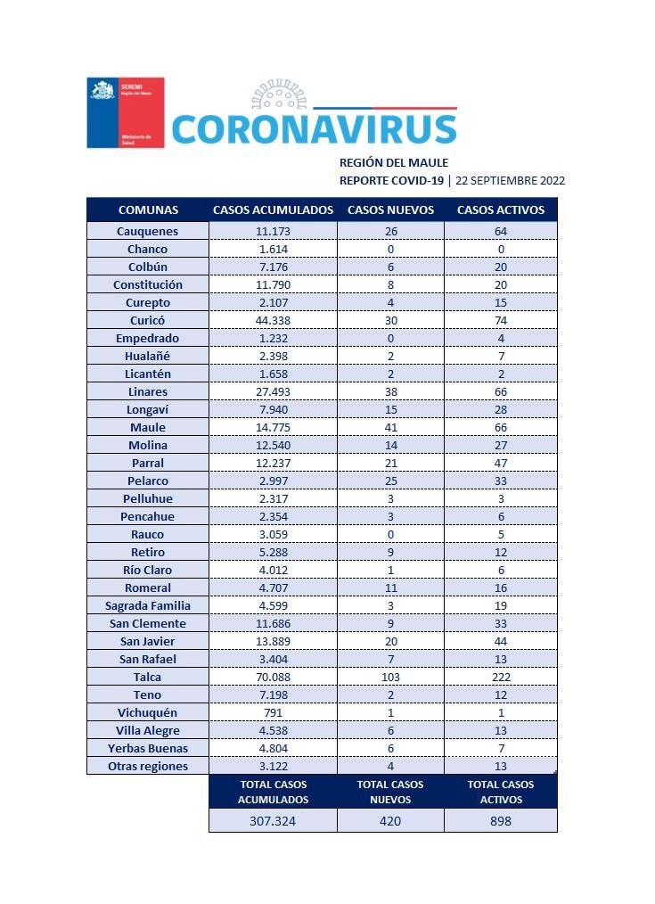 En un nuevo informe sobre la situación del Covid-19 en el Maule, desde la Seremi de Salud expusieron que en las últimas horas se registraron 420 nuevos casos, de los cuales, 293 presentaron síntomas y 37 fueron asintomáticos. Lo anterior, deja un total de 307.324 pacientes diagnosticados con la enfermedad en la región desde que comenzó la pandemia. Con respecto a los fallecidos, no se contabilizaron nuevos decesos, por lo que la cifra total de muertos se mantiene en 3.114.