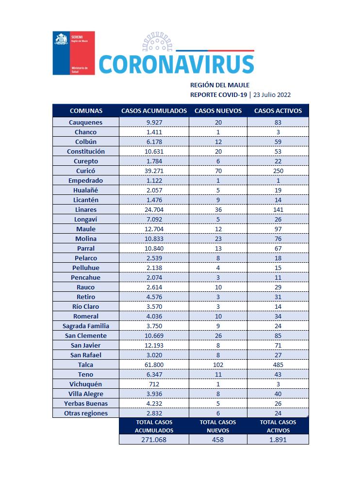Las comunas con más casos activos son: Talca 485, Curicó 250, Linares 141, Maule 97 y San Clemente 85.