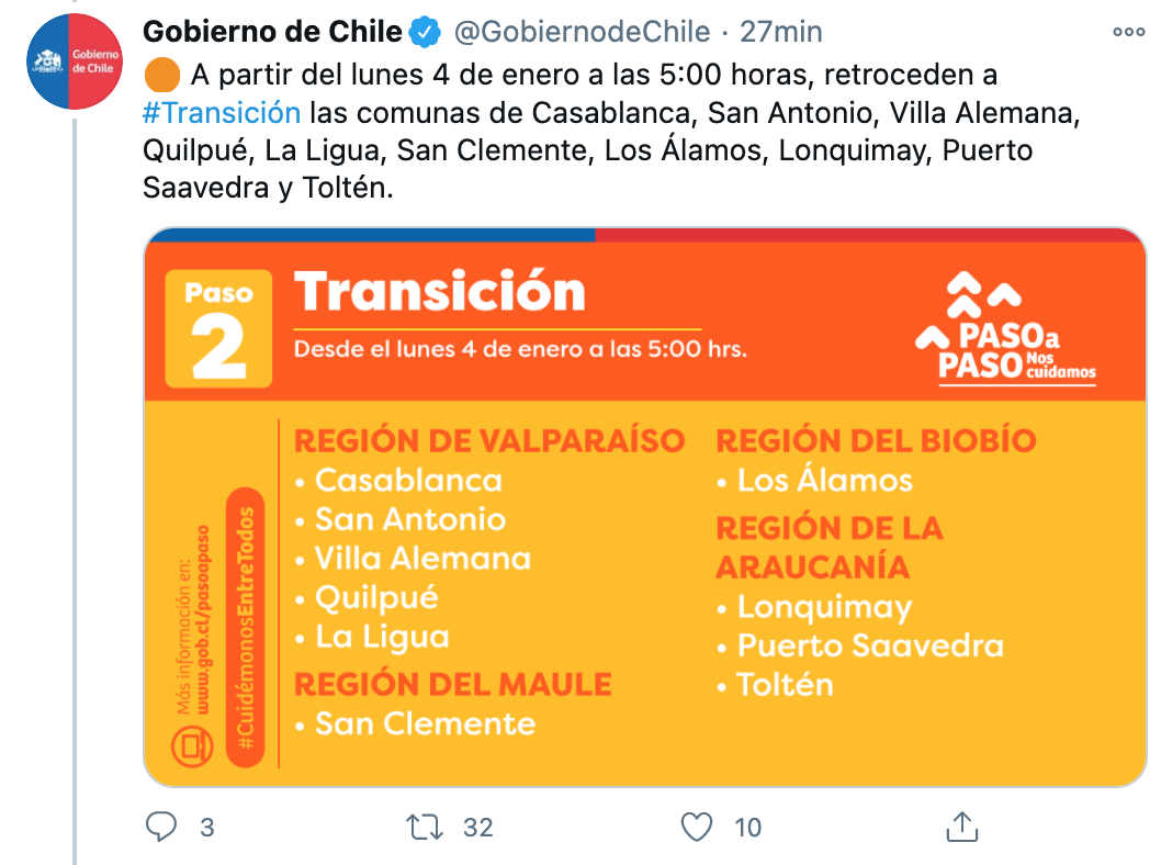 También, en el reporte de hoy el Ministerio de Salud dio a conocer que Romeral y Molina pasarán a fase uno, entrando a "Cuarentena" total desde este lunes 04 de enero a las 05:00 horas. Mientras que San Clemente lo hará a la fase dos, es decir a "Transición" en la misma fecha y hora.