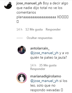 "Sí los leo, solo que no respondo wevadas", señaló Di Girolamo, quien más tarde se llenó de aclamadas respuestas que apludieron su defensa. En tanto, la persona que criticó a la actriz, se llenó de insultos y comentarios que señalaron frases como "Y a vo quien te pateó al jaula".